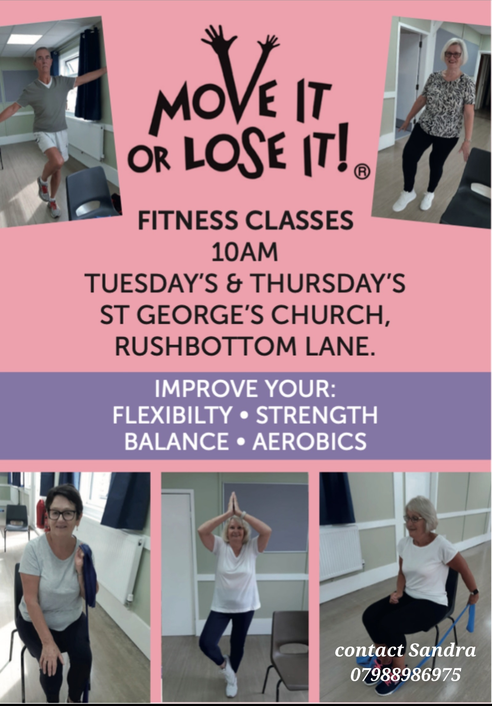 Over 60s, workout class. Improve your flexibility, balance, strength and aerobic fitness. Contact Sandra for more details.